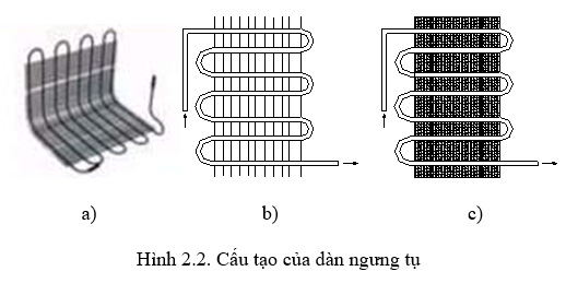 - Cấu tạo: Đa số dàn ngưng tụ của tủ lạnh nén hơi có cấu tạo như hình 2.2. Bao gồm các ống thép (thường là Φ5÷ Φ 6) và các cánh tản nhiệt. Môi chất lạnh đi từ trên xuống, còn không khí đối lưu tự nhiên đi từ dưới lên, quá trình trao đổi nhiệt ở đây là trao đổi nhiệt đối lưu tự nhiên kiểu ngược dòng.