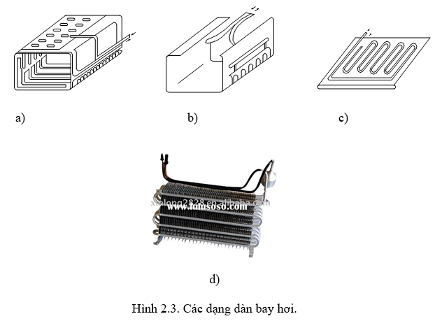 - Cấu tạo: Dàn bay hơi trong tủ lạnh phần lớn là dàn bay hơi kiểu tấm, có bố trí các rãnh cho việc tuần hoàn môi chất. Không khí đi bên ngoài đối lưu tự nhiên. Vật liệu thường bằng nhôm hoặc thép không gỉ. Tuy nhiên cũng có một số dàn ngưng làm bằng đồng có cánh tản nhiệt, dàn ngưng loại này thường trao đổi nhiệt kiểu đối lưu cưỡng bức bằng quạt.